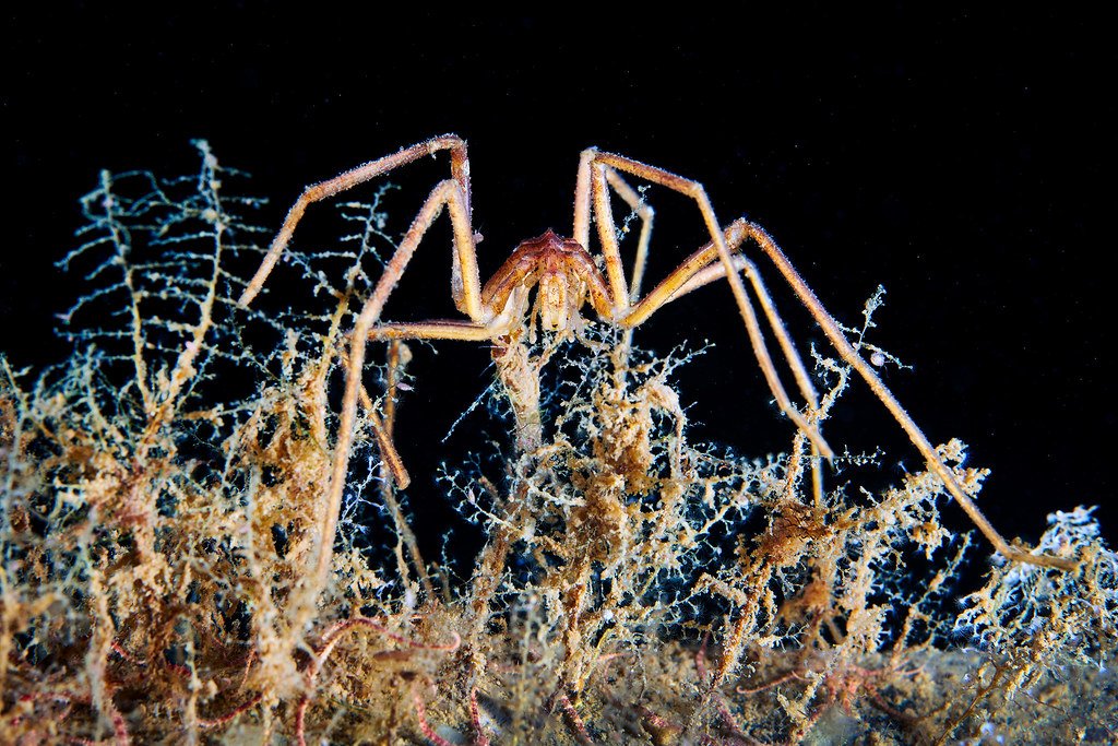 Ces araignées de mer, environ 1 000 espèces vivant en milieux marins variés, ont un petit corps cylindrique et de très longues pattes. Carnivores, elles se nourrissent d’animaux au corps mou en s’agrippant à eux pour en aspirer les tissus.